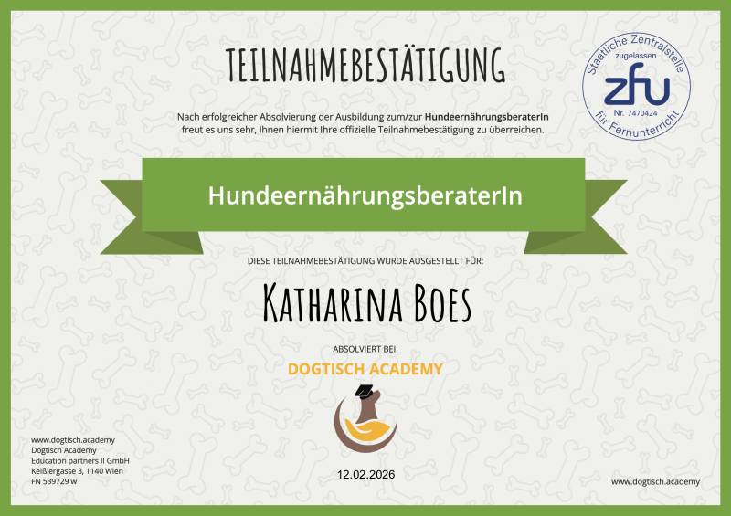 Aufgrund ihrer Vorgeschichte und diverser Probleme mit ihrer Ernährung, habe ich eine Ausbildung zur Hundeernährungsberaterin absolviert.